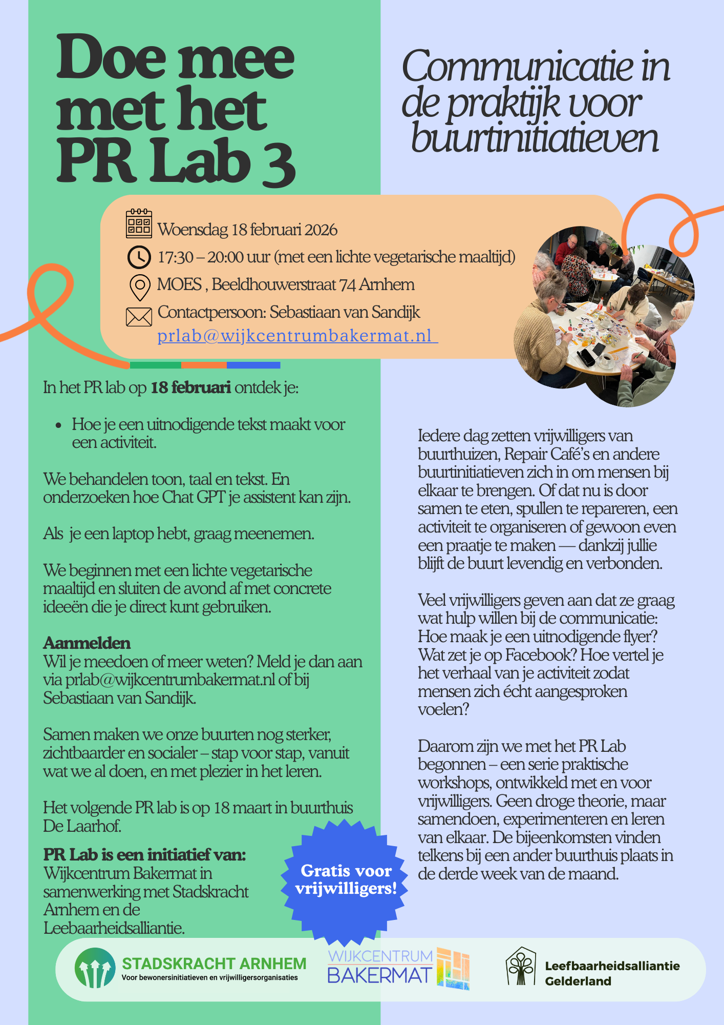 Het PR-Lab is gratis voor vrijwilligers en vindt plaats in de derde week van de maand, op een wisselende dag en locatie.